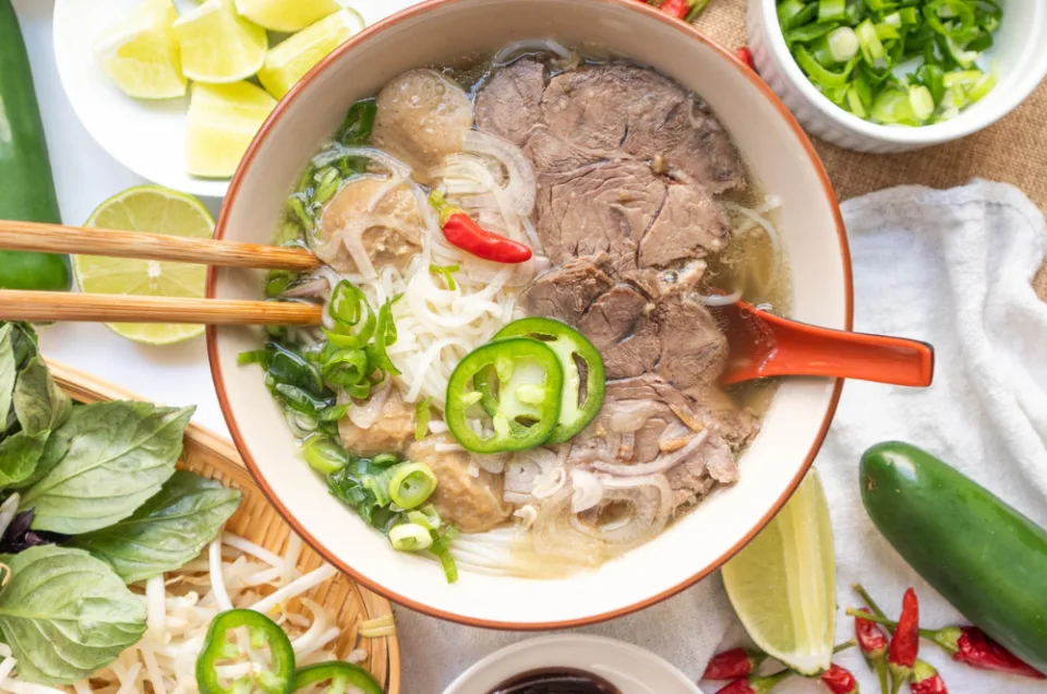 Beef soup, done: cooked rice noodles, cooked beef, bib lettuce, onion rings, green onion in top. Pour over all ingredients 1 cup boiling bouillon.